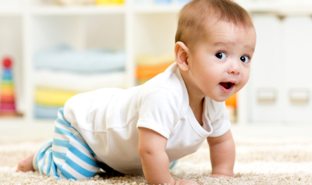 Rörelseförmågan förbättras och barnet förflyttar sig allt mer själv genom att hasa, åla, krypa eller kanske genom att ta sina första steg, om hen har någon att hålla sig i. Finmotoriken blir också bättre, till exempel kan barnet använda tumme och pekfinger för att plocka upp små föremål. Så här långt utvecklad motorik utgör en milstolpe i barnets självständighet eftersom hen nu själv kan ta sig till och nå saker. För de vuxna kan det vara en bra idé att säkra hemmet för ivriga barnhänder.